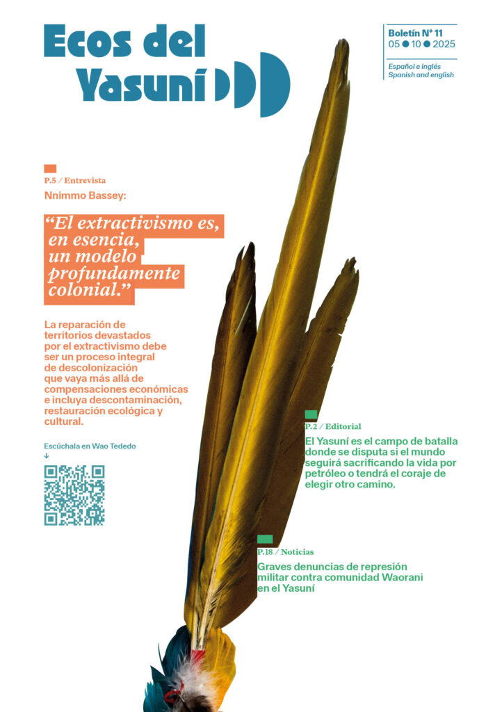 Este número aborda la disputa geopolítica por el Yasuní, donde convergen intereses petroleros de China, que busca asegurar suministros energéticos en la Amazonía ecuatoriana, y de Estados Unidos, que propone instalar bases militares en Ecuador. A dos años del referéndum histórico donde el 57% de ecuatorianos votó por dejar el petróleo bajo tierra, el gobierno ha cerrado apenas 10 de 247 pozos activos, incumpliendo el mandato popular. La edición presenta una entrevista con el activista nigeriano Nnimmo Bassey, quien vincula extractivismo con colonialismo y propone que la reparación territorial debe incluir auditorías independientes, descontaminación, restauración ecológica-cultural y justicia epistémica, promoviendo la «Yasunización del mundo» como estrategia global anticolonial. Finalmente, denuncia la represión militar contra la comunidad Waorani de Mintaro en septiembre de 2025, con detenciones arbitrarias durante protestas, evidenciando la criminalización de la resistencia indígena en defensa de sus territorios ancestrales.